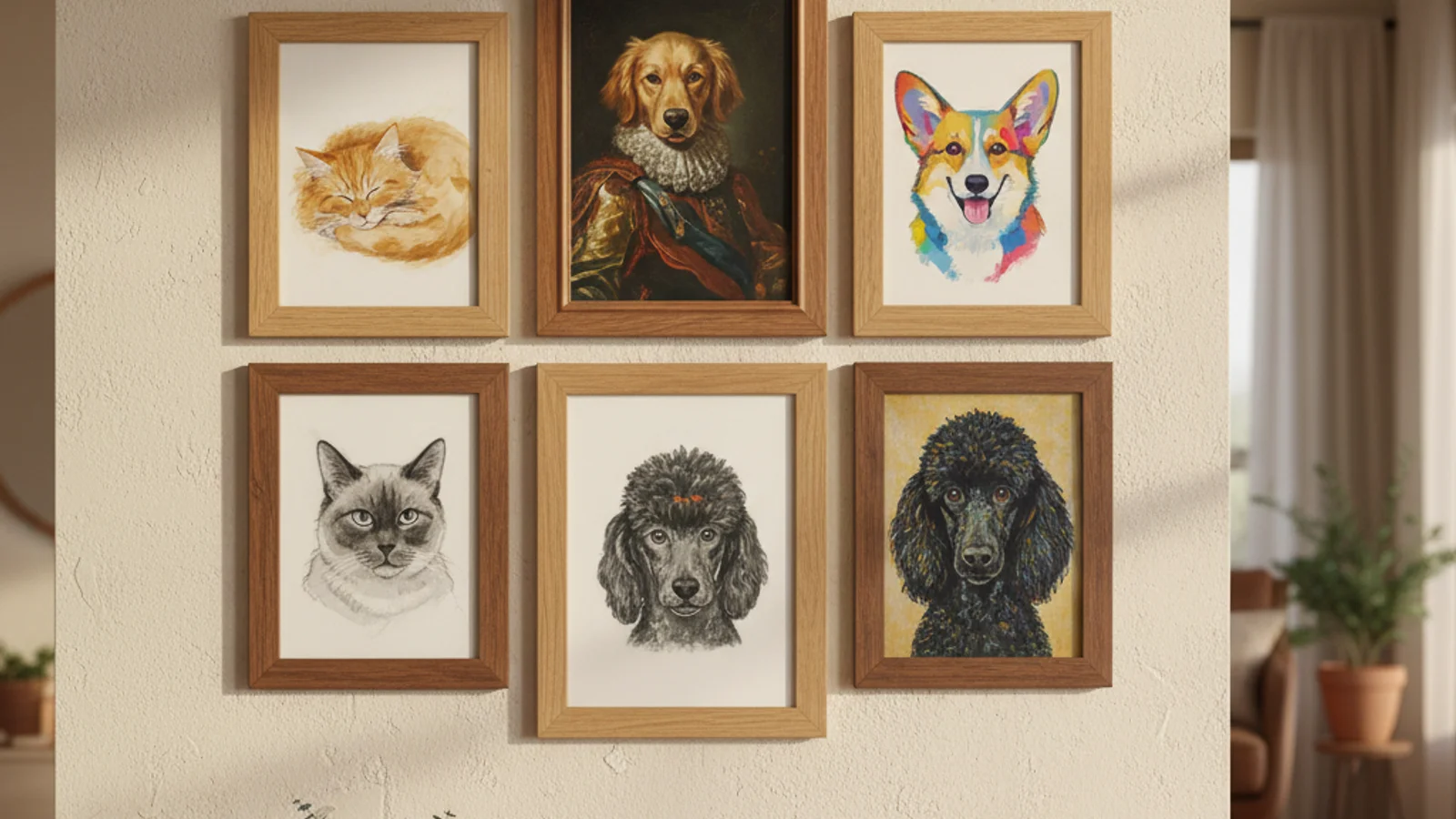 Wall gallery of framed pet portraits